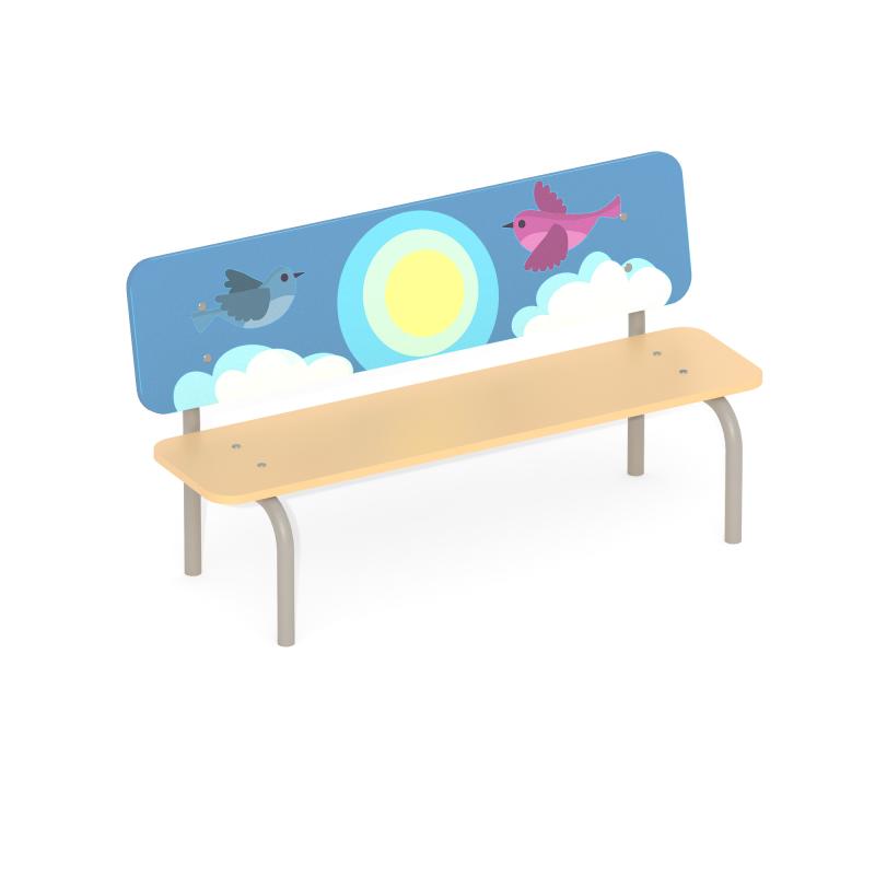 Скамья детская «Romana 302.09.00» двухцветная детская скамейка со спинкой для детских площадок, спортивных городков, детских садов. Спинка изделия декорирована рисунком «Птички», выполненным «УФ»-печатью.