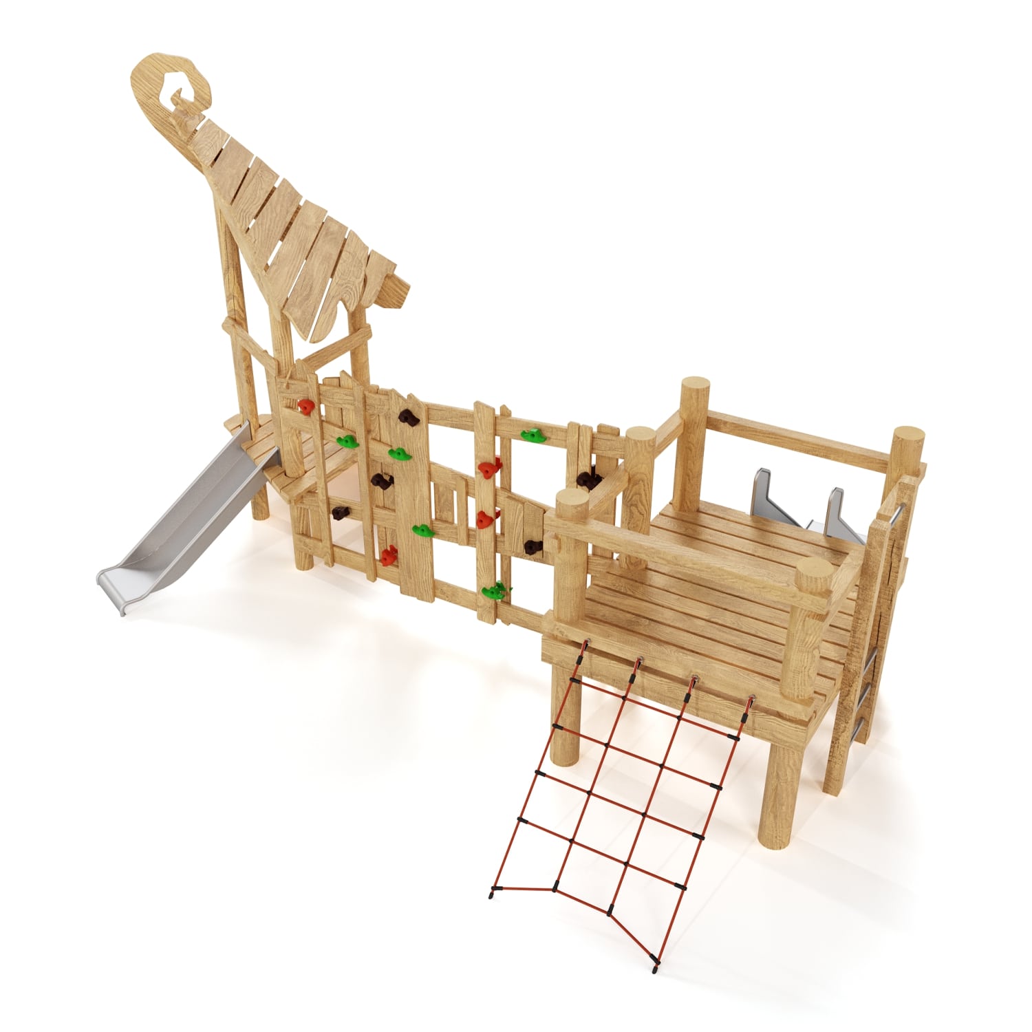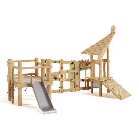 Каркас, обшивка – дерево, обработанное антисептиком и маслом террасным атмосферостойким для древесины. Горки, скаты - сталь нержавеющая толщиной не менее 2 мм, электрохимическая пассивация сварных швов. Канатные сети, лазы - канат армированный 16 мм. Зацепы для скалолазания - пескобетонный композит.
