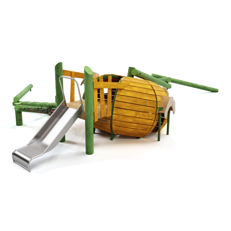 Каркас - сталь конструкционная, покрытие - цинкосодержащий грунт, окраска полимерным порошком или двухкомпонентной полиуретан-акриловой краской. Настил - дерево (массив), покрытие антисептиком и маслом в 2 слоя. Горка - сталь нержавеющая толщиной не менее 2 мм. Канатные сети, лазы - канат армированный 16 мм.