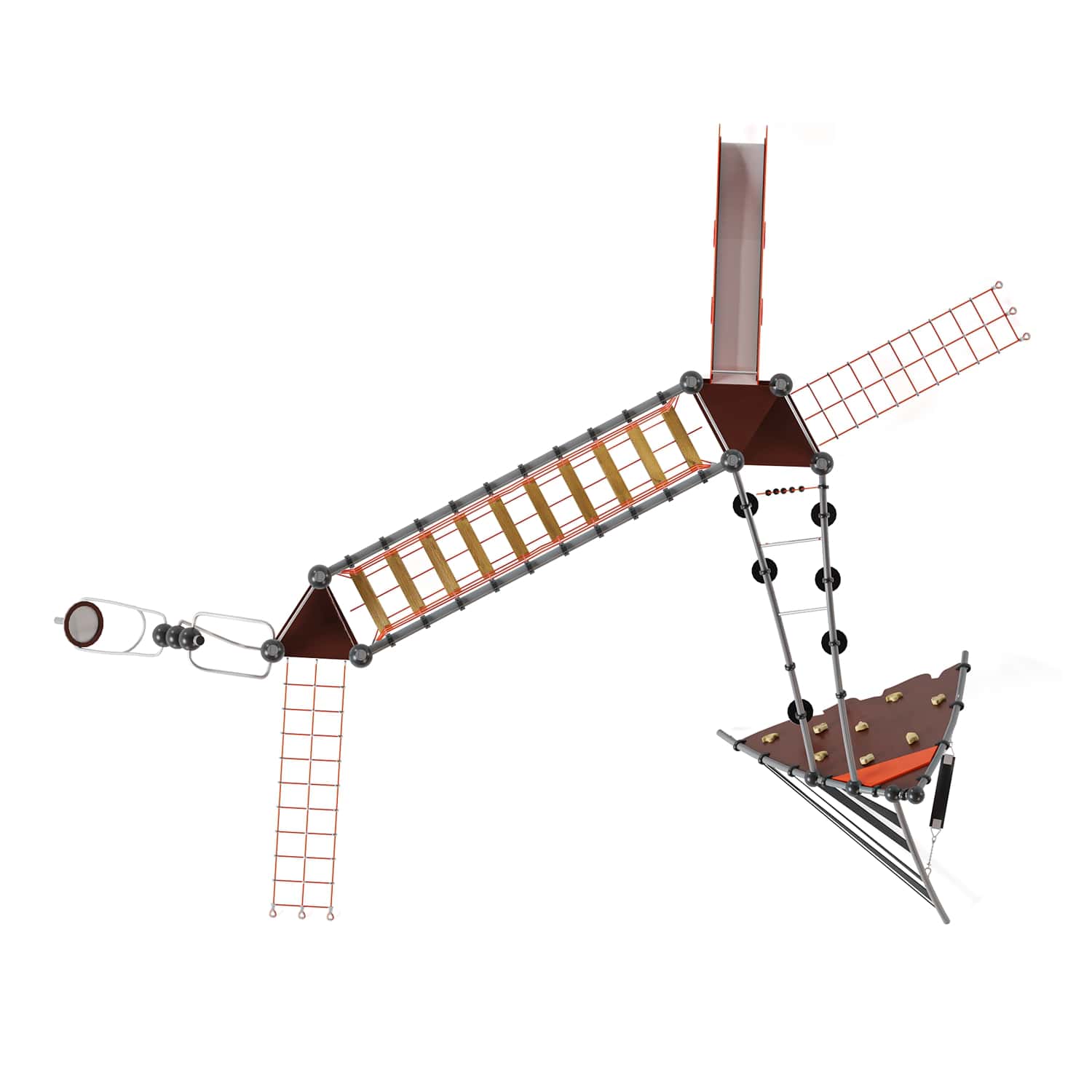 Каркас - сталь конструкционная, покрытие - цинкосодержащий грунт, окраска полимерным порошком. Горка - сталь нержавеющая толщиной не менее 2 мм, электрохимическая пассивация сварных швов. Панели, ограждения - полипропилен/HPL. Канатные сети, лазы - канат армированный 16 мм. Зацепы для скалолазания - пескобетонный композит. Конвейерная лента. Отдельные элементы - лиственница (массив), обработанная антисептиком и маслом террасным атмосферостойким для древесины.