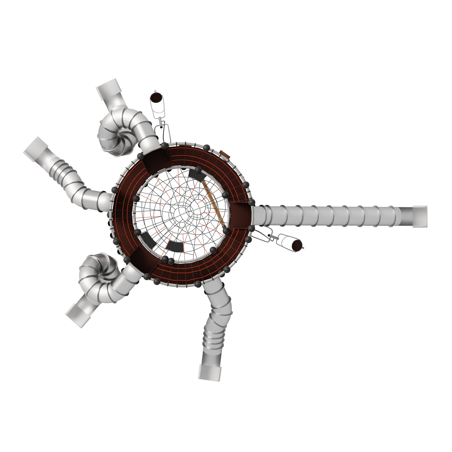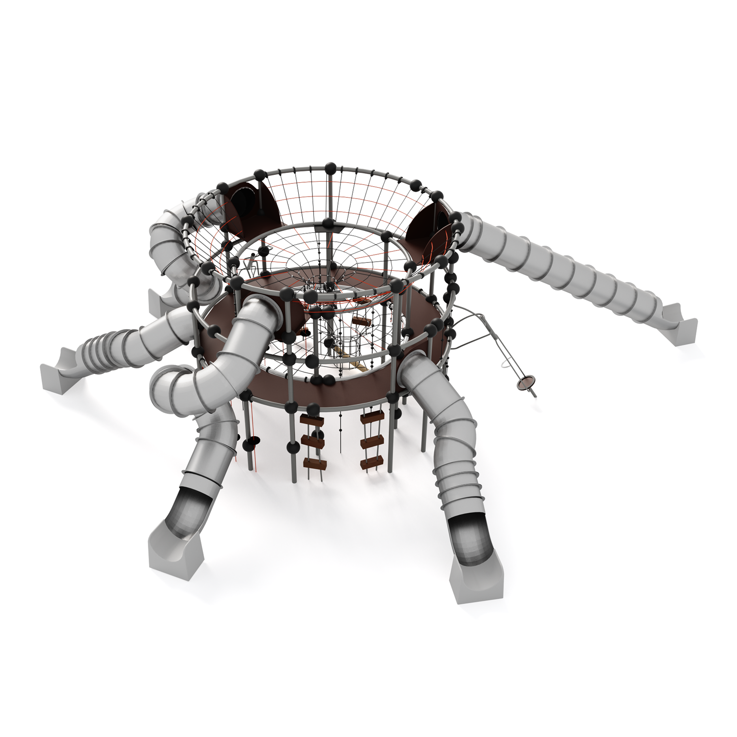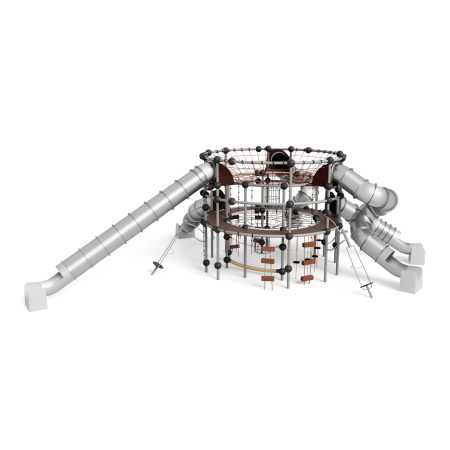 Каркас - сталь конструкционная, покрытие - цинкосодержащий грунт, окраска полимерным порошком. Горки, скаты - сталь нержавеющая толщиной не менее 2 мм, электрохимическая пассивация сварных швов. Панели, ограждения - полипропилен/HPL. Канатные сети, лазы, ограждения - канат армированный 16 мм.