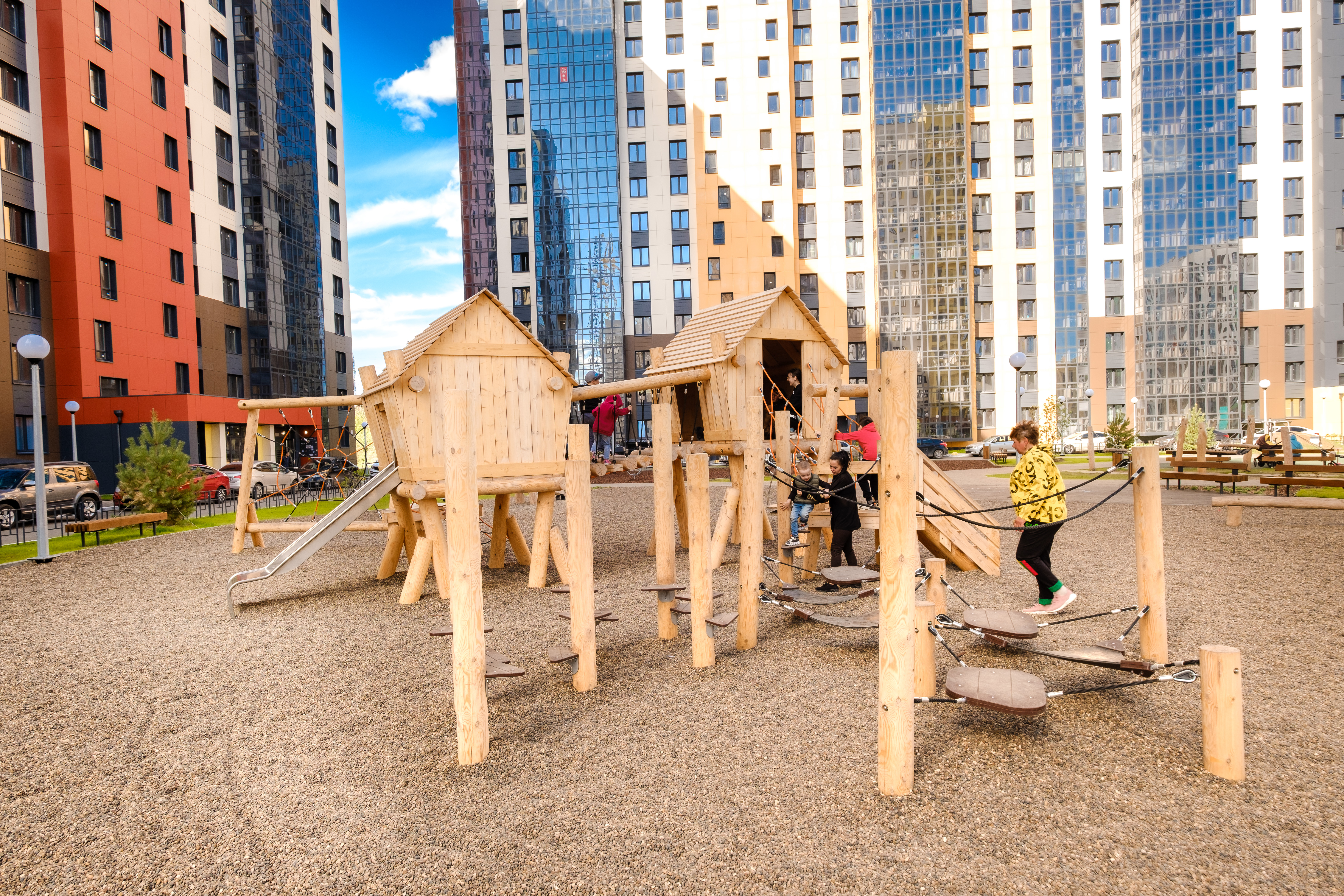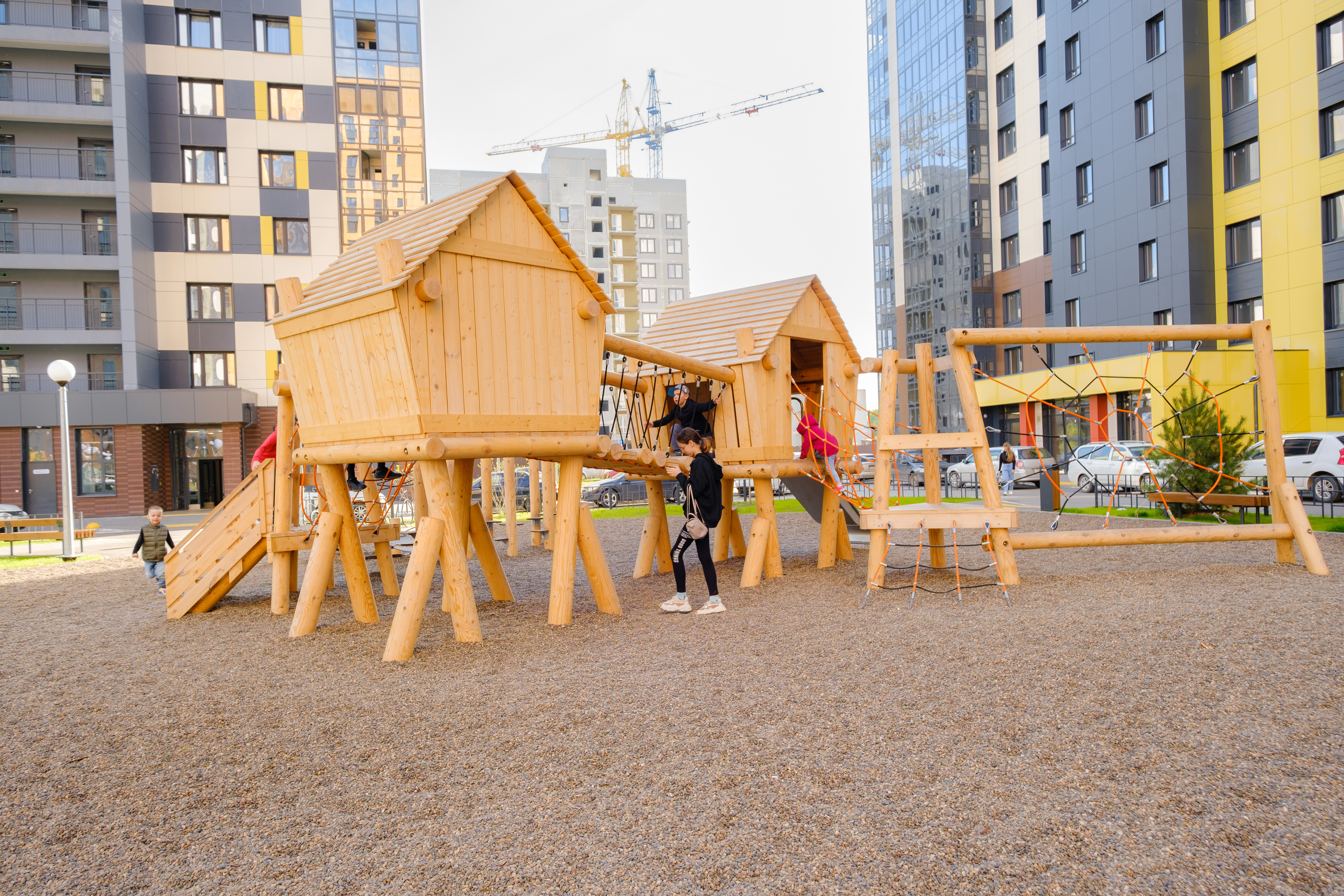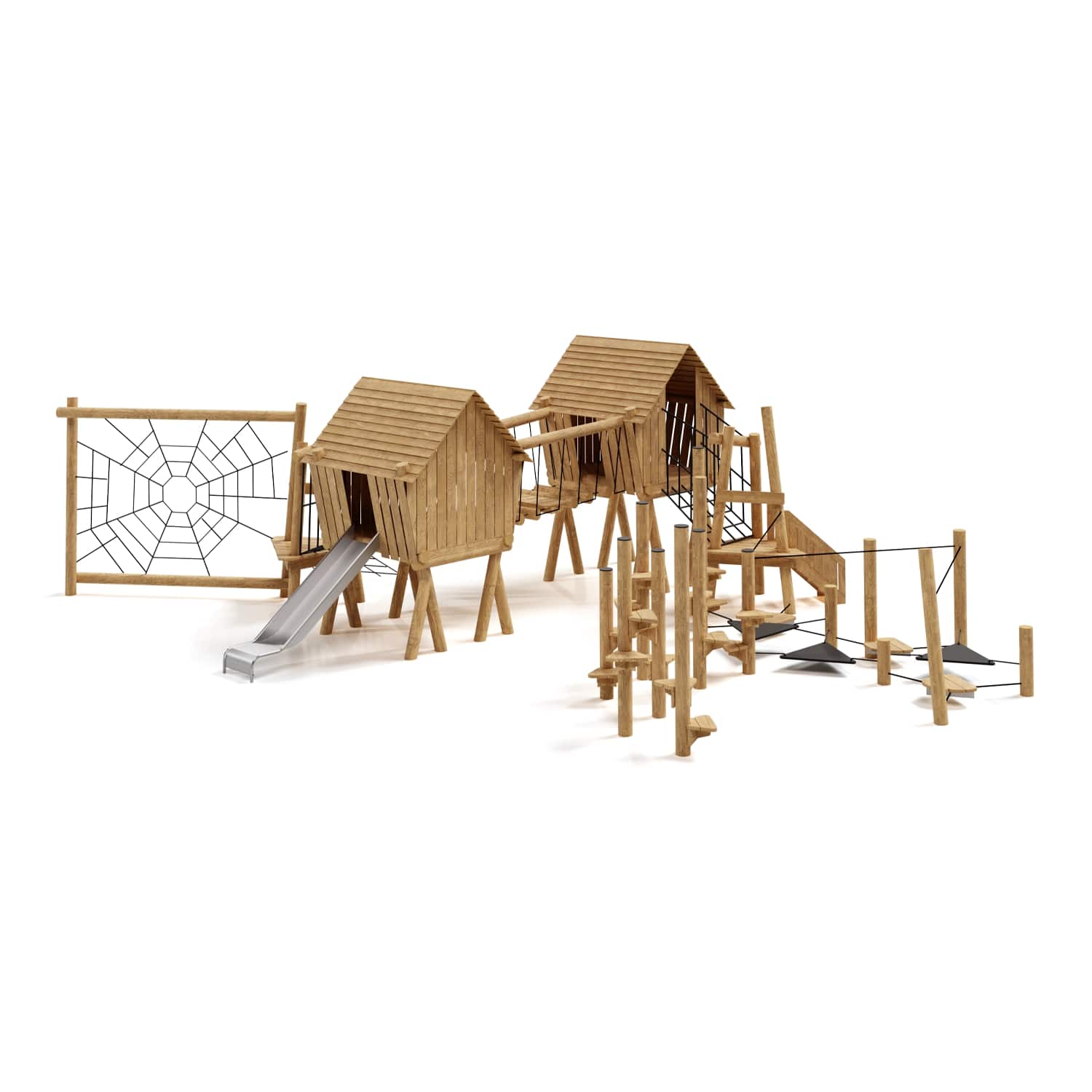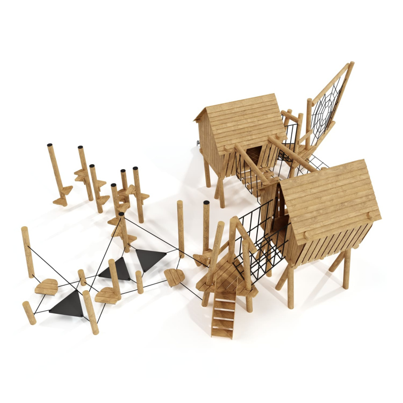 Каркас, обшивка – дерево, обработанное антисептиком и маслом террасным атмосферостойким для древесины. Канатные сети, лазы, ограждения - канат армированный 16 мм. Горки, скаты - сталь нержавеющая толщиной не менее 2 мм.