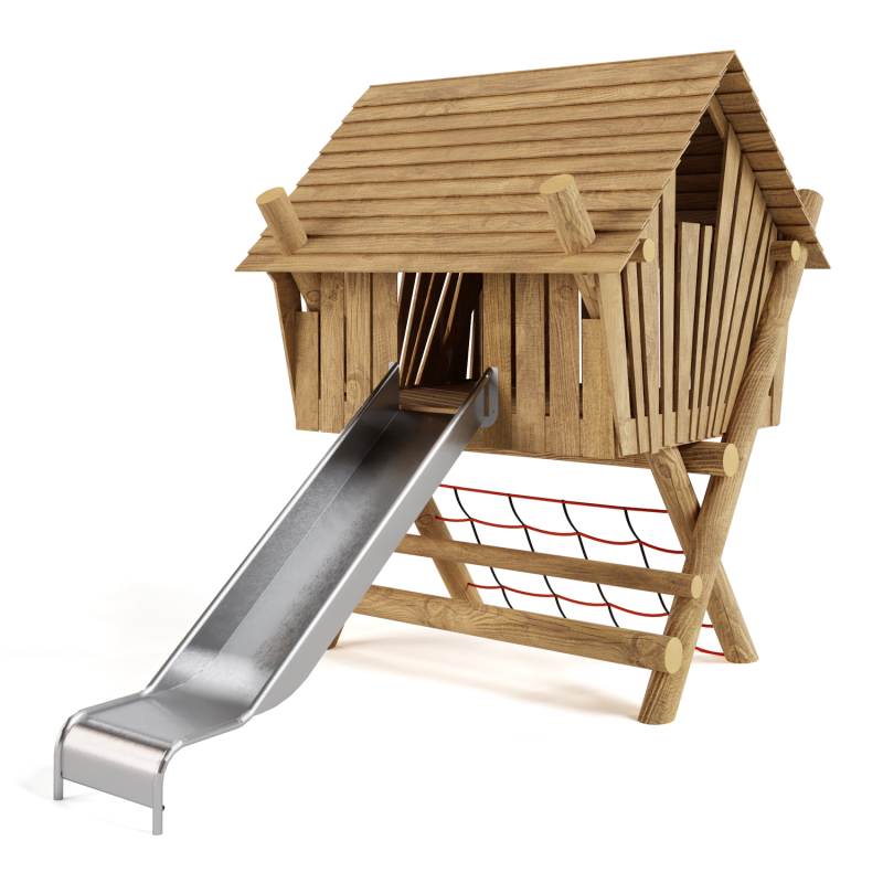 Каркас, обшивка - дерево, покрытие - антисептик, масло террасное атмосферостойкое или акриловая эмаль атмосферостойкая для древесины. Канатные сети, лазы, ограждения - канат армированный 16 мм. Горки, скаты - сталь нержавеющая толщиной не менее 2 мм, электрохимическая пассивация сварных швов.