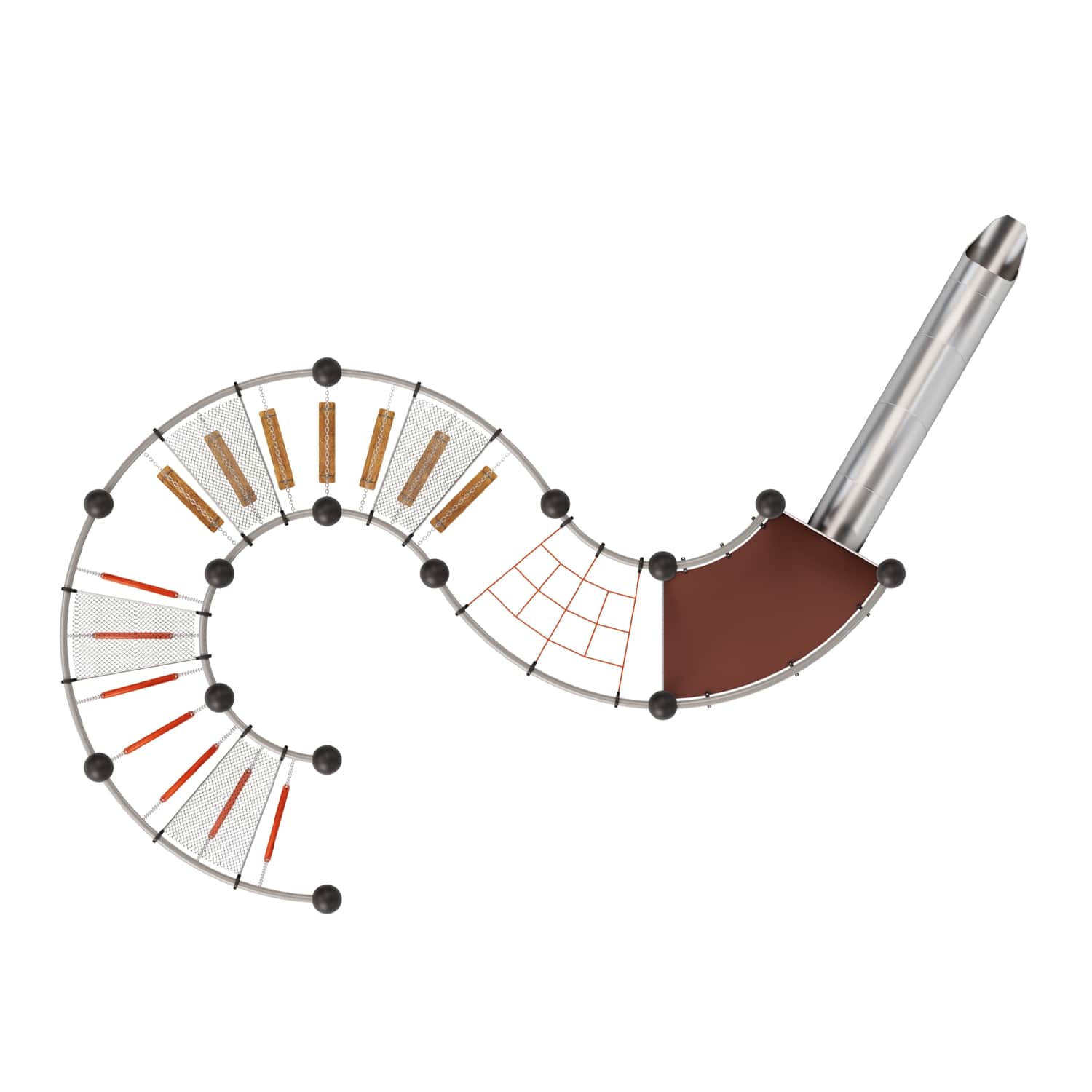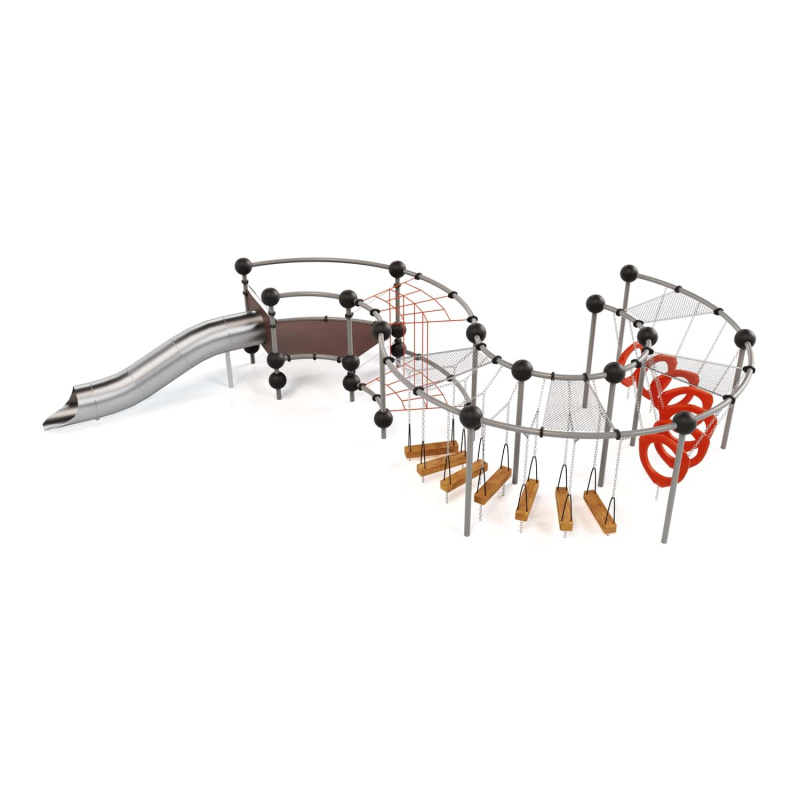 Каркас - сталь конструкционная, покрытие - цинкосодержащий грунт, окраска полимерным порошком. Горка - сталь нержавеющая толщиной не менее 2 мм, электрохимическая пассивация сварных швов. Панели - полипропилен/HPL. Канатные сети, лазы, ограждения - канат армированный 16 мм. Лиственница (массив), обработанная антисептиком и маслом террасным атмосферостойким для древесины.