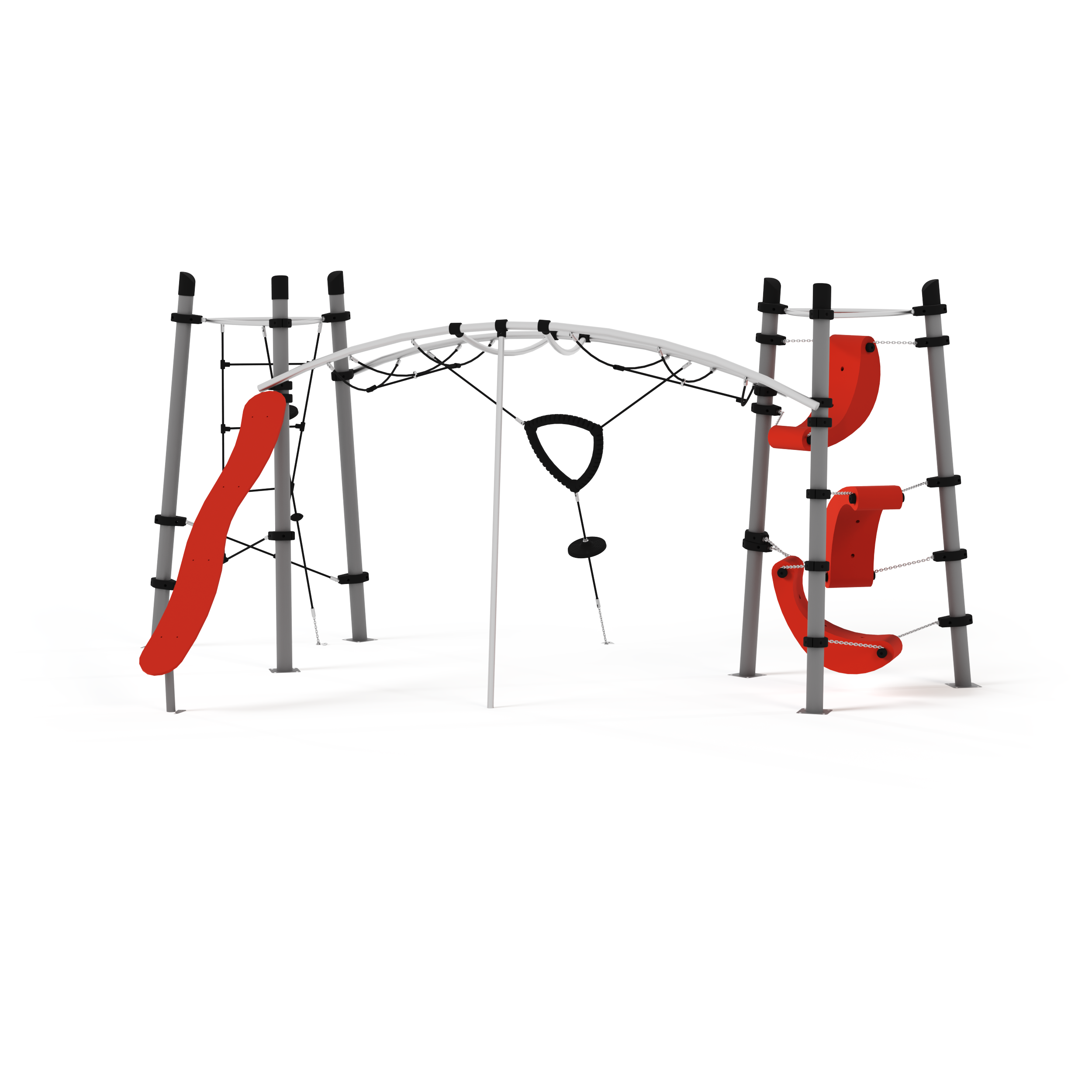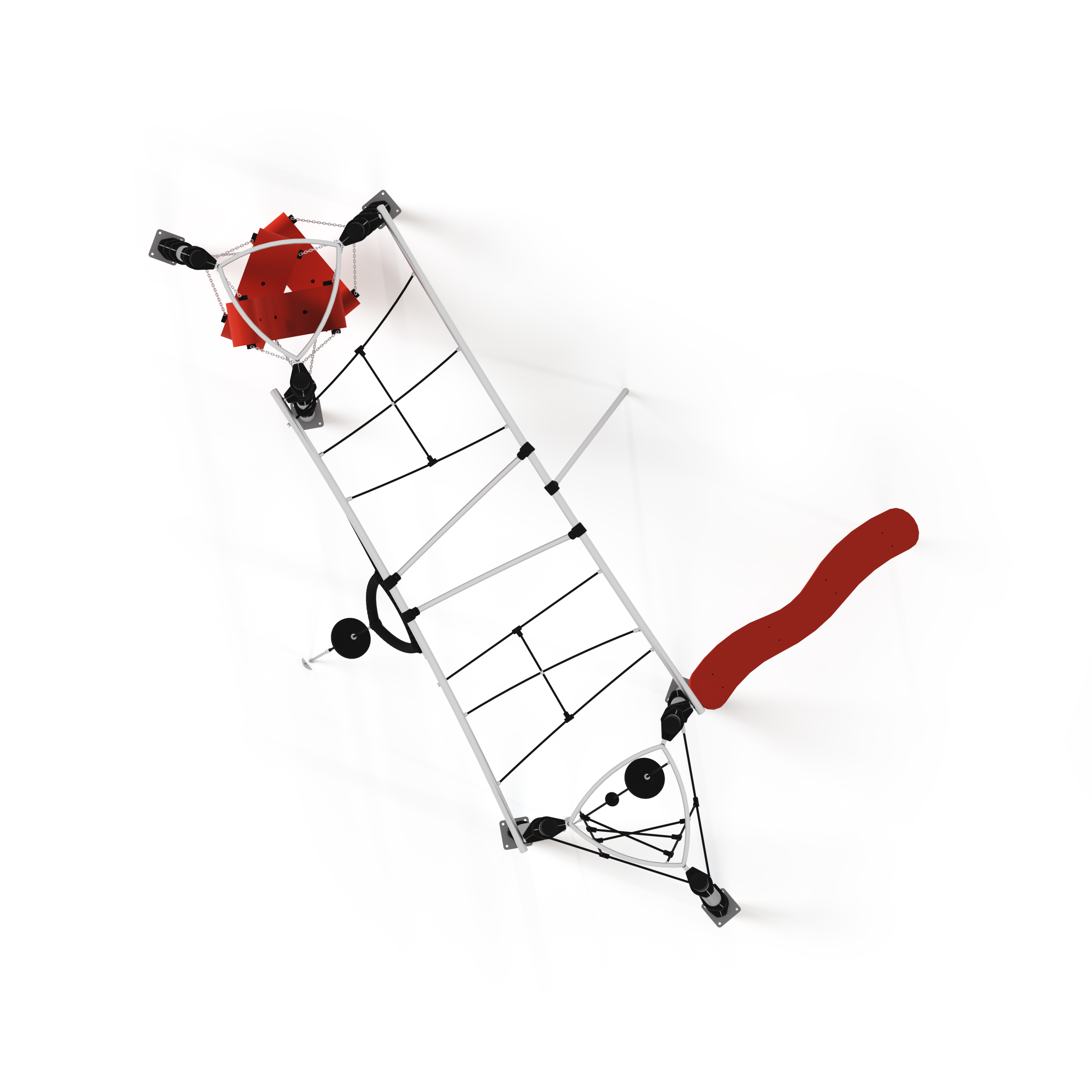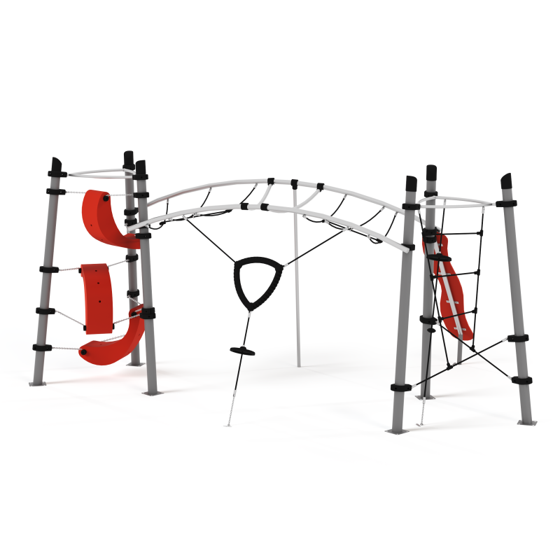 Опорные столбы 108 мм, покрытие – цинкосодержащий грунт, порошковая окраска. Хомуты, переходники для труб - стеклонаполненный полиамид. Перекладины – 34 мм, покрытие цинкосодержащий грунт, порошковая окраска. Канатные части из армированного 6-прядного каната диаметром 16 мм, канатные части с защитными ручками и ставками в ячейку. Лазательные элементы выполнены из материалов ПНД и полиамида.