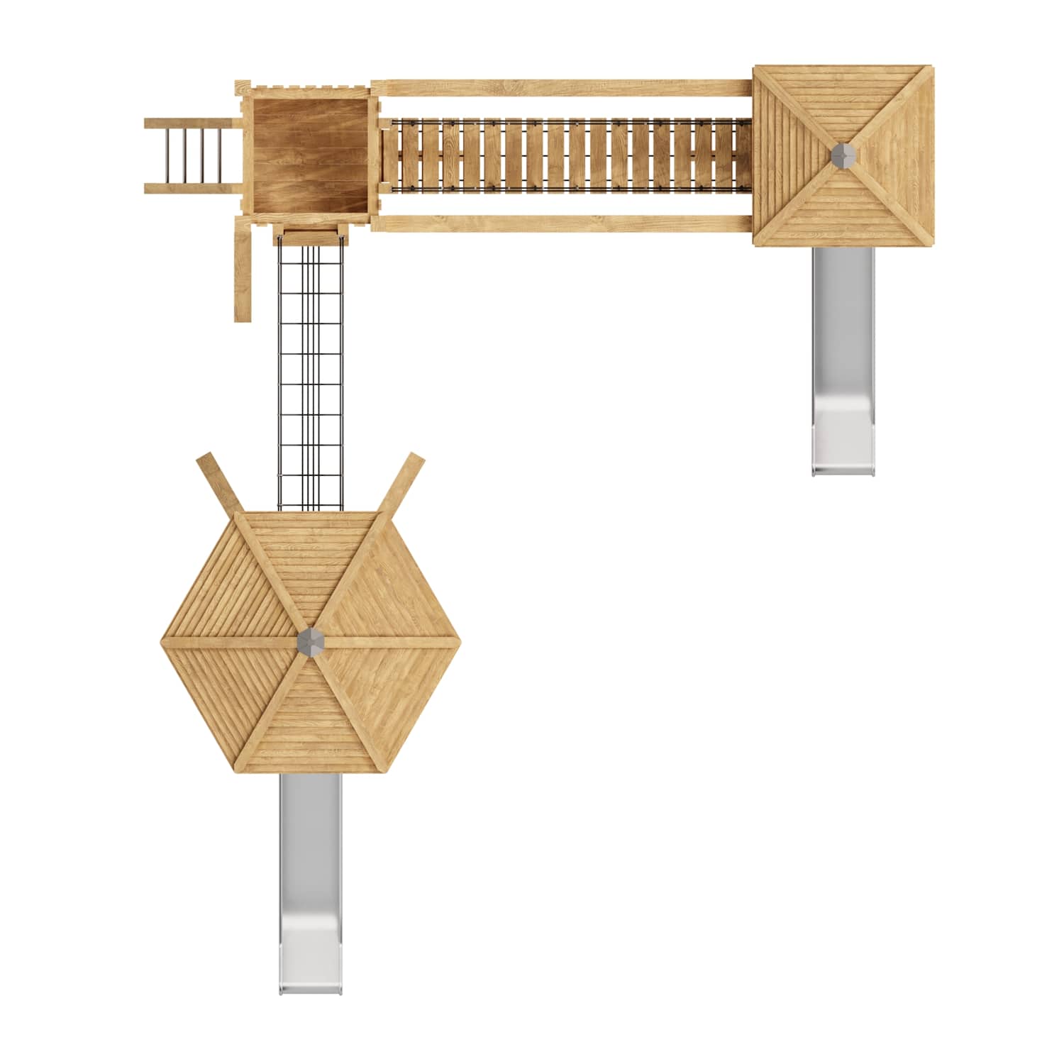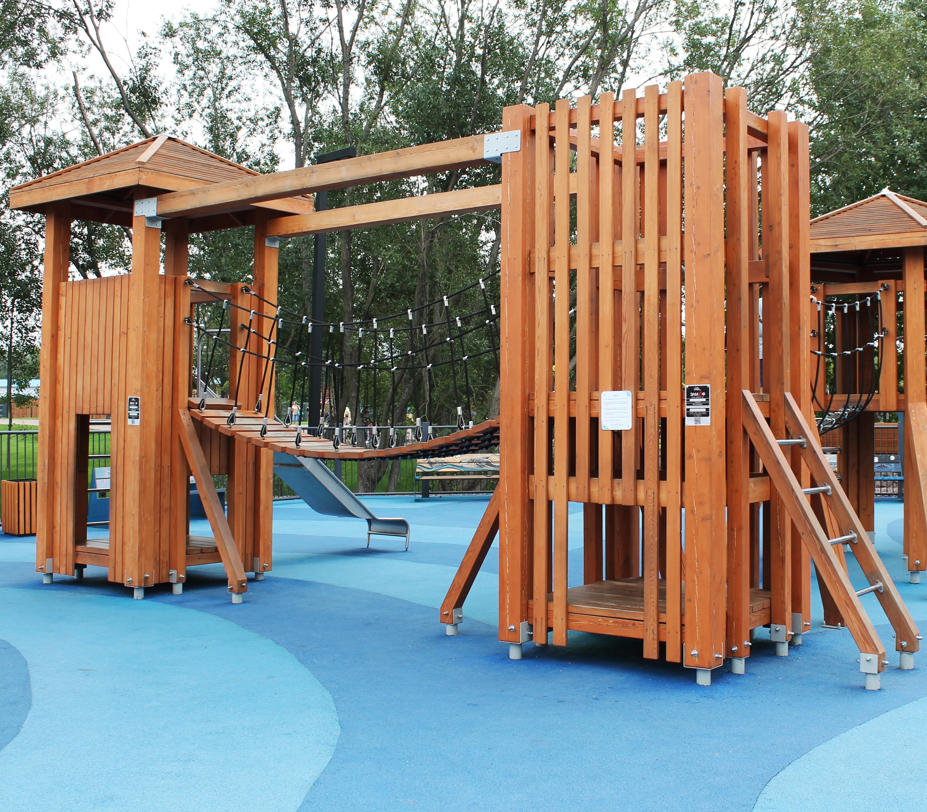 Каркас, обшивка – дерево, обработанное антисептиком и маслом террасным атмосферостойким для древесины. Канатные сети, лазы, ограждения - канат армированный 16 мм. Горки, скаты - сталь нержавеющая толщиной не менее 2 мм.