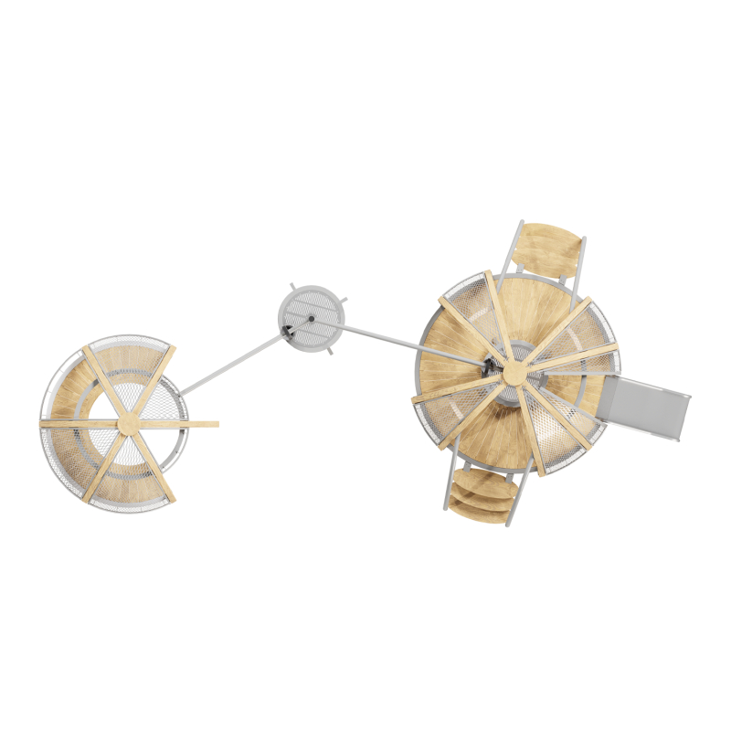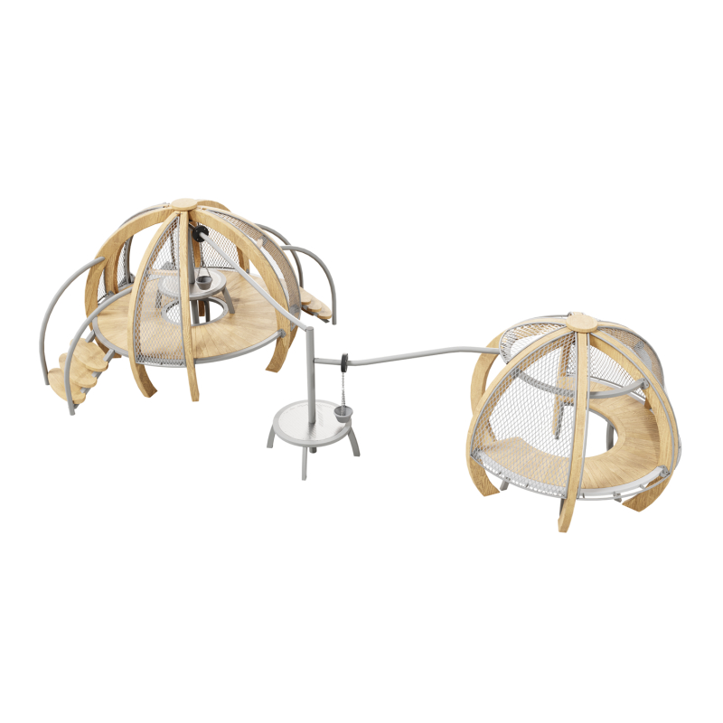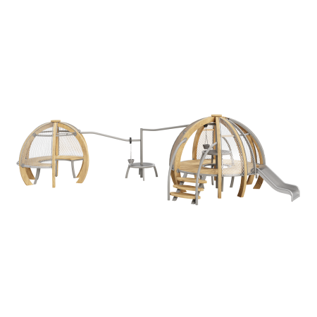 Каркас - сталь конструкционная, покрытие - цинкосодержащий грунт, окраска полимерным порошком (RAL по согласованию). Обшивка – лиственница, покрытие - масло террасное атмосферостойкое. Горки - сталь нержавеющая толщиной не менее 2 мм, электрохимическая пассивация сварных швов. Канатные сети - канат армированный 16 мм. Монолитный поликарбонат.