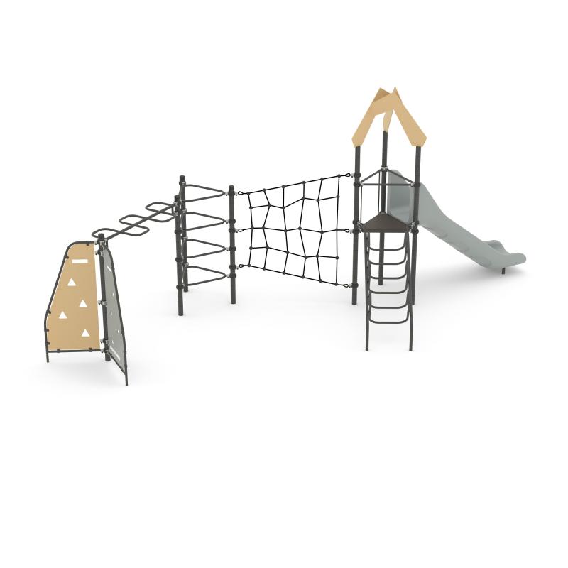 Спортивно - игровой комплекс для тематических игр и физического развития предназначен для детей в возрасте от 8 до 12 лет. Изделие представляет собой устойчивую конструкцию, обеспечивающую безопасные условия для занятий на открытом воздухе. Конструкция обладает высокой ударопрочностью и виброустойчивостью.Выполнен в виде металлических стоек, образующих треугольник, к стойкам прикреплены канатный лаз, панель-лаз, горка, лаз-змейка.