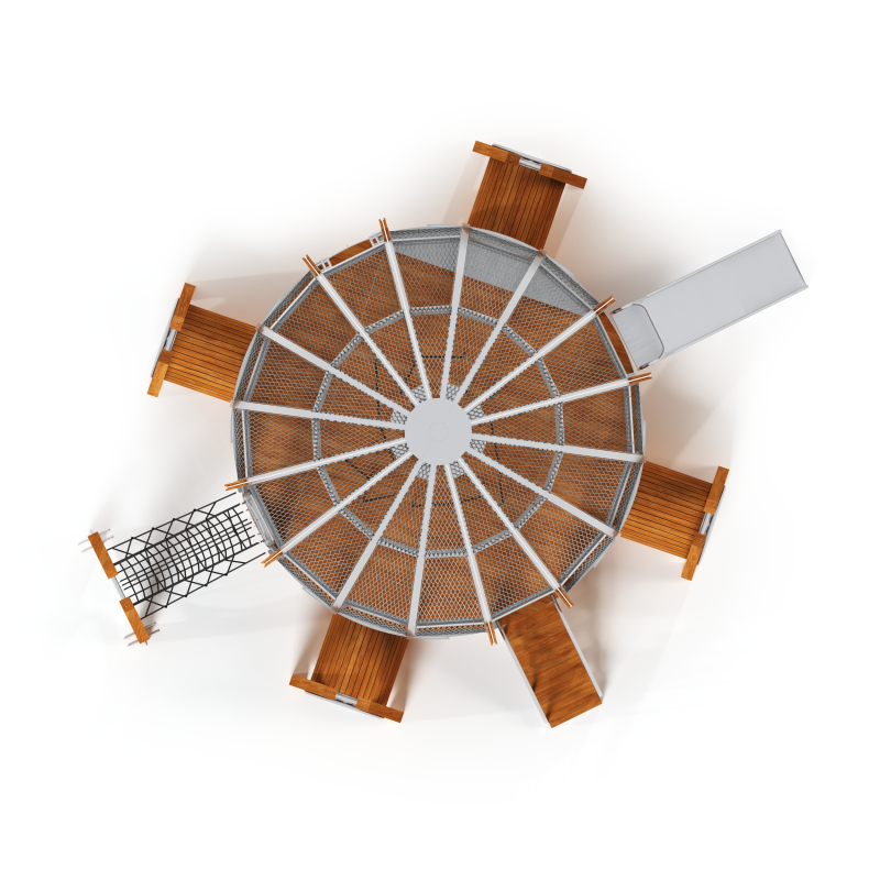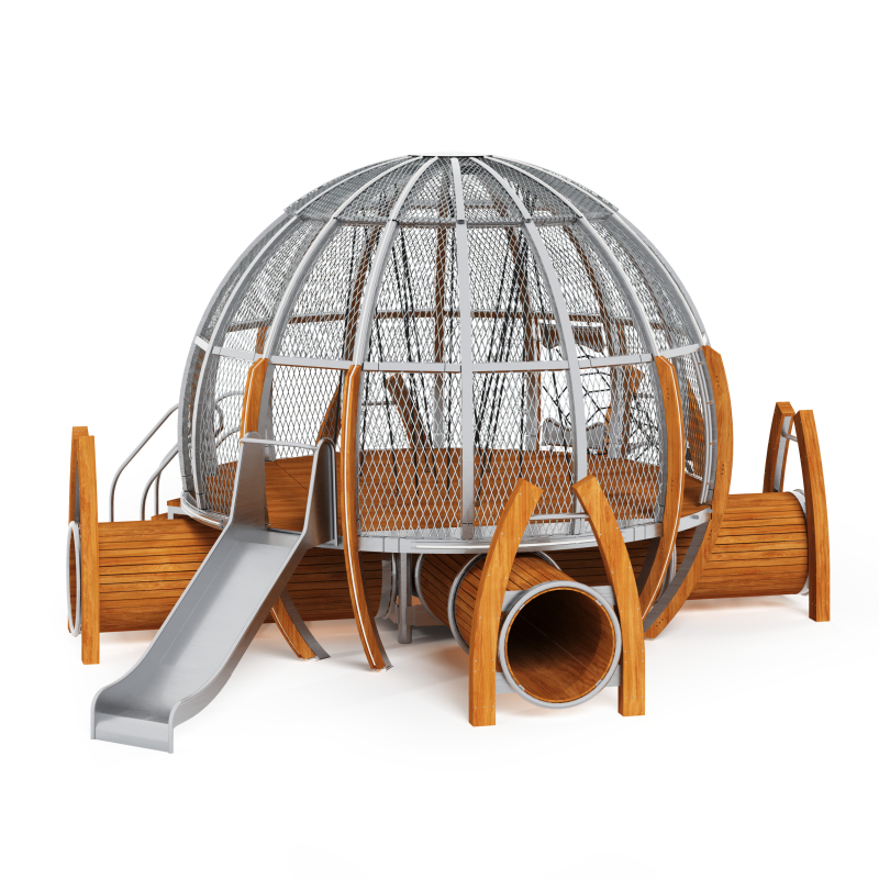 Каркас - сталь конструкционная, покрытие - цинкосодержащий грунт, окраска полимерным порошком (RAL по согласованию). Обшивка – лиственница, покрытие - масло террасное атмосферостойкое. Горки - сталь нержавеющая толщиной не менее 2 мм, электрохимическая пассивация сварных швов. Канатные сети - канат армированный 16 мм. Монолитный поликарбонат.