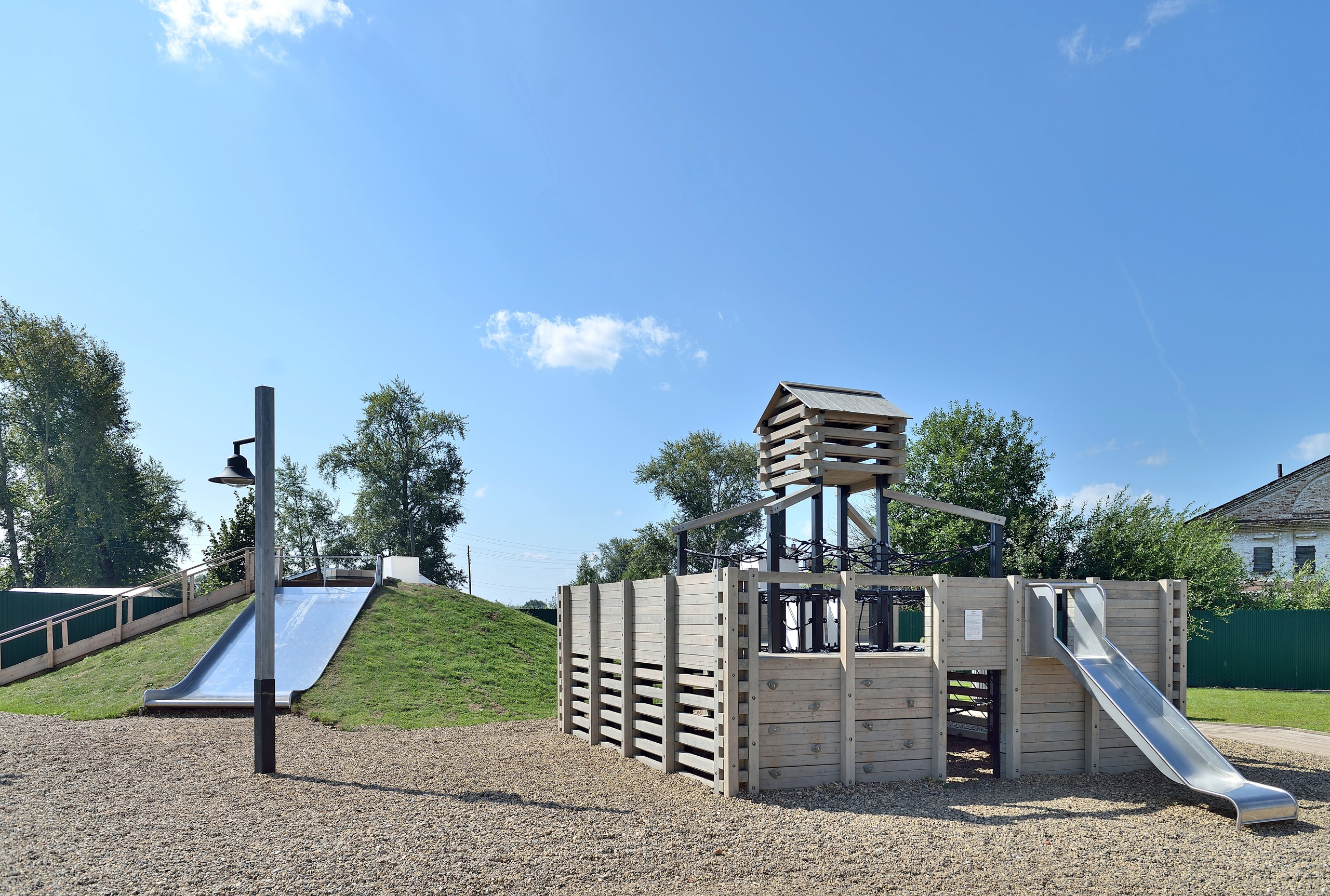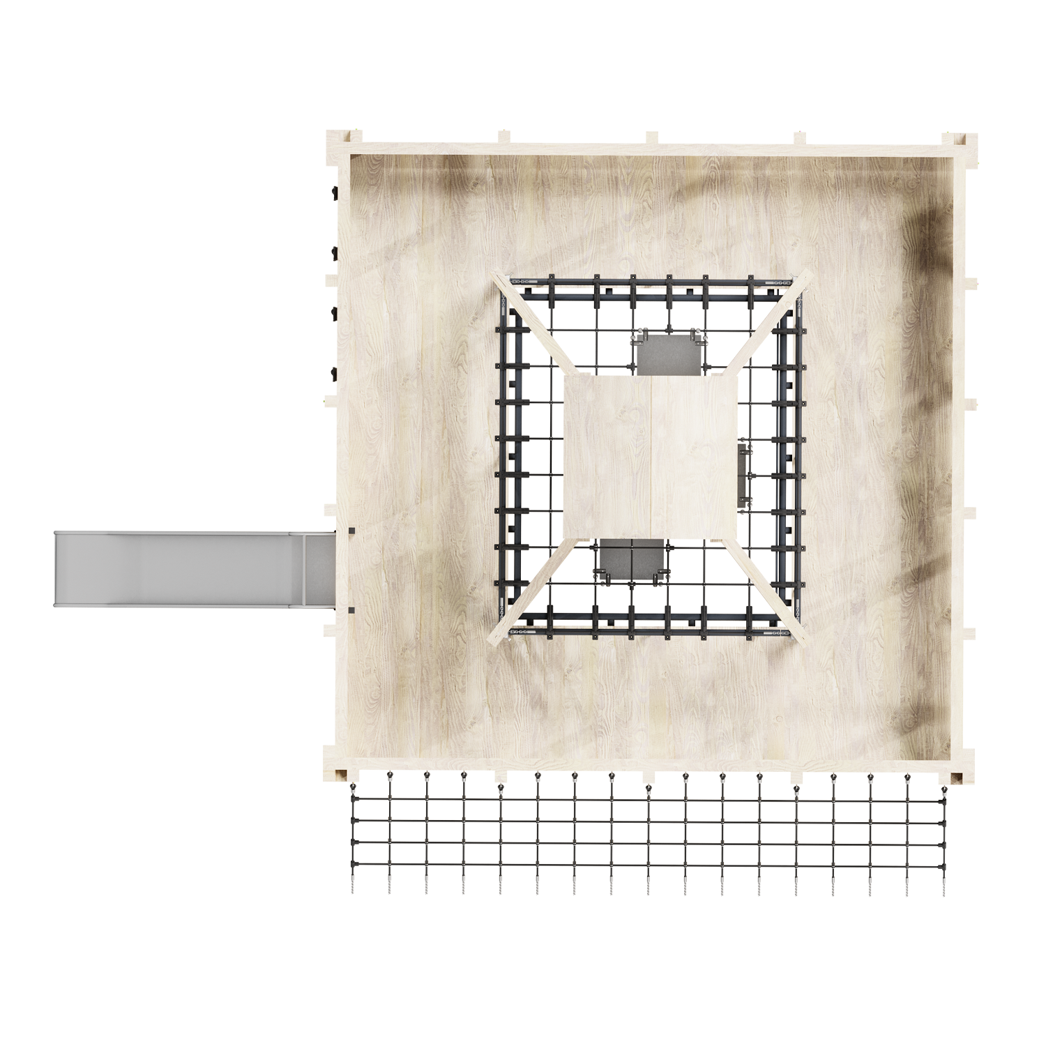Каркас - сталь конструкционная, покрытие - цинкосодержащий грунт, окраска полимерным порошком или двухкомпонентной полиуретан-акриловой краской. Обшивка – дерево (массив), покрытие - антисептик, масло террасное атмосферостойкое для древесины. Горки, скаты - сталь нержавеющая толщиной не менее 2 мм. Канатные сети, лазы, ограждения - канат армированный 16 мм.