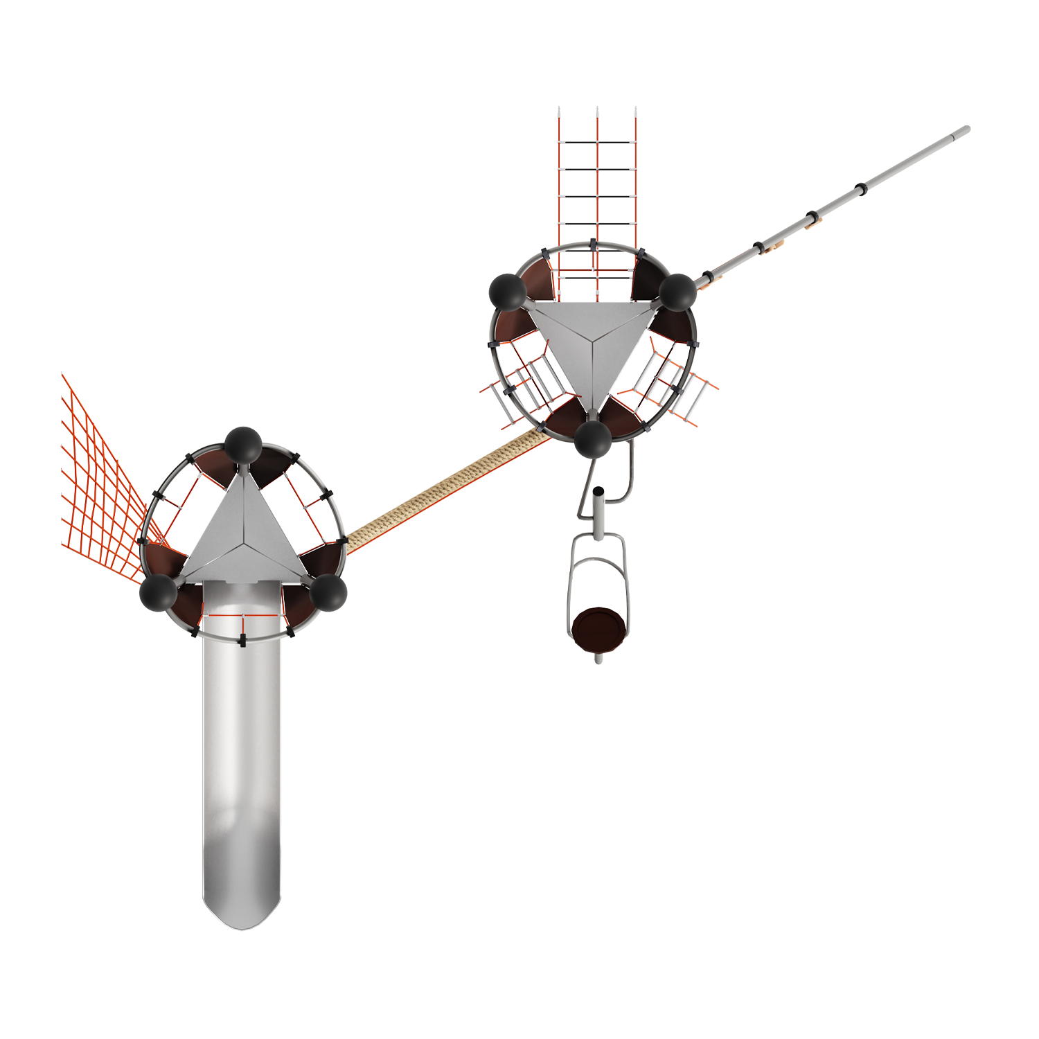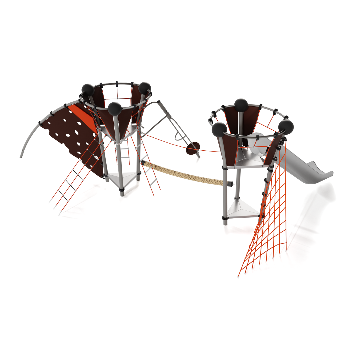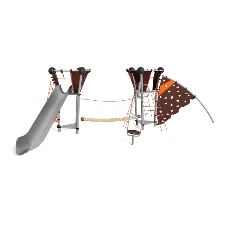 Каркас - сталь конструкционная, покрытие - цинкосодержащий грунт, окраска полимерным порошком. Горка - сталь нержавеющая толщиной не менее 2 мм, электрохимическая пассивация сварных швов. Панели - полипропилен/HPL. Канатные сети, лазы, ограждения - канат армированный 16 мм. Зацепы для скалолазания - пескобетонный композит. Конвейерная лента. Канат "Викинг".