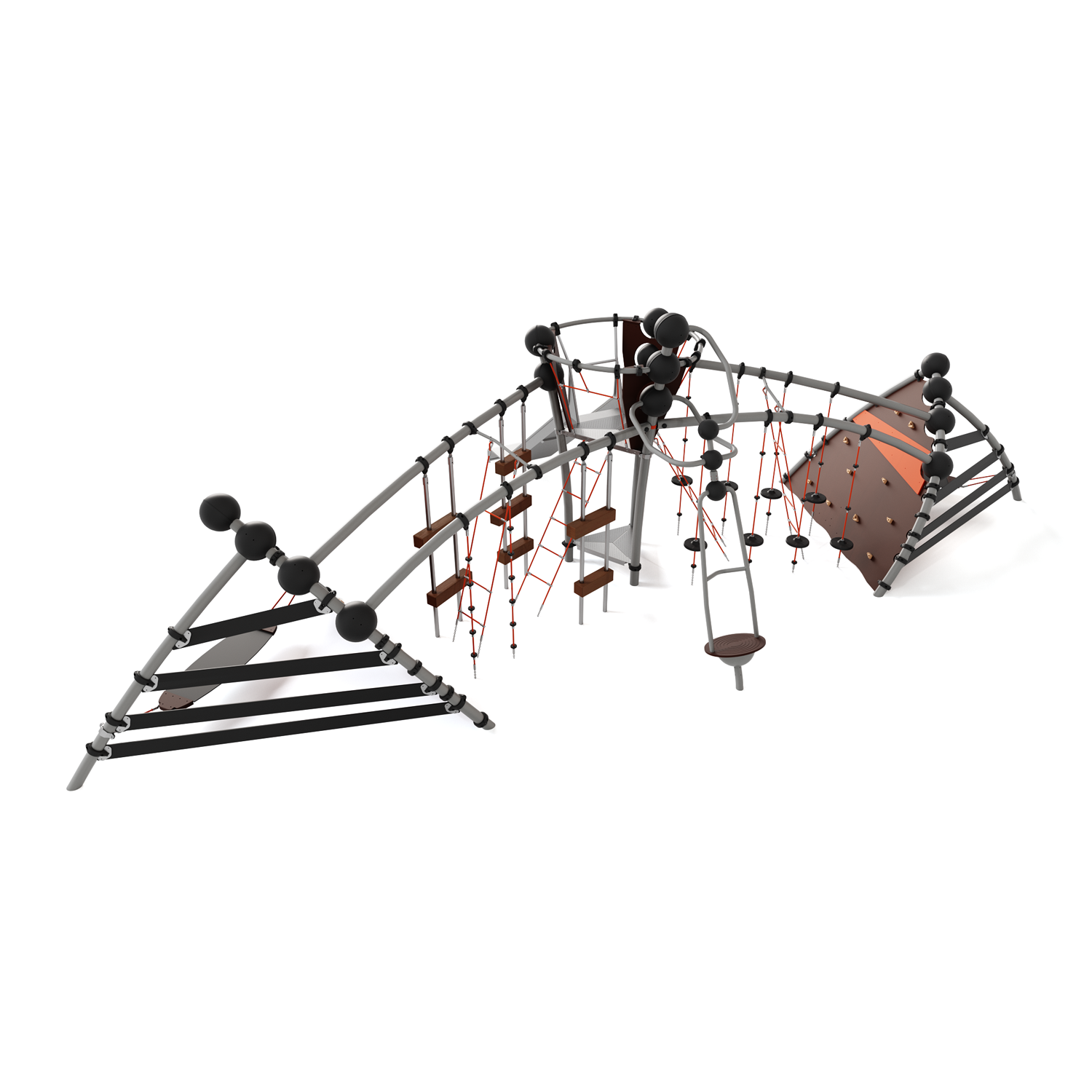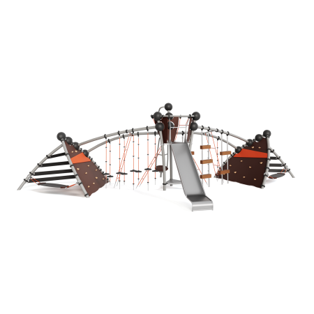 Каркас - сталь конструкционная, покрытие - цинкосодержащий грунт, окраска полимерным порошком. Горка - сталь нержавеющая толщиной не менее 2 мм, электрохимическая пассивация сварных швов. Панели - полипропилен/HPL. Канатные сети, лазы, ограждения - канат армированный 16 мм. Зацепы для скалолазания - пескобетонный композит. Конвейерная лента. Отдельные элементы - лиственница (массив), обработанная антисептиком и маслом террасным атмосферостойким для древесины.