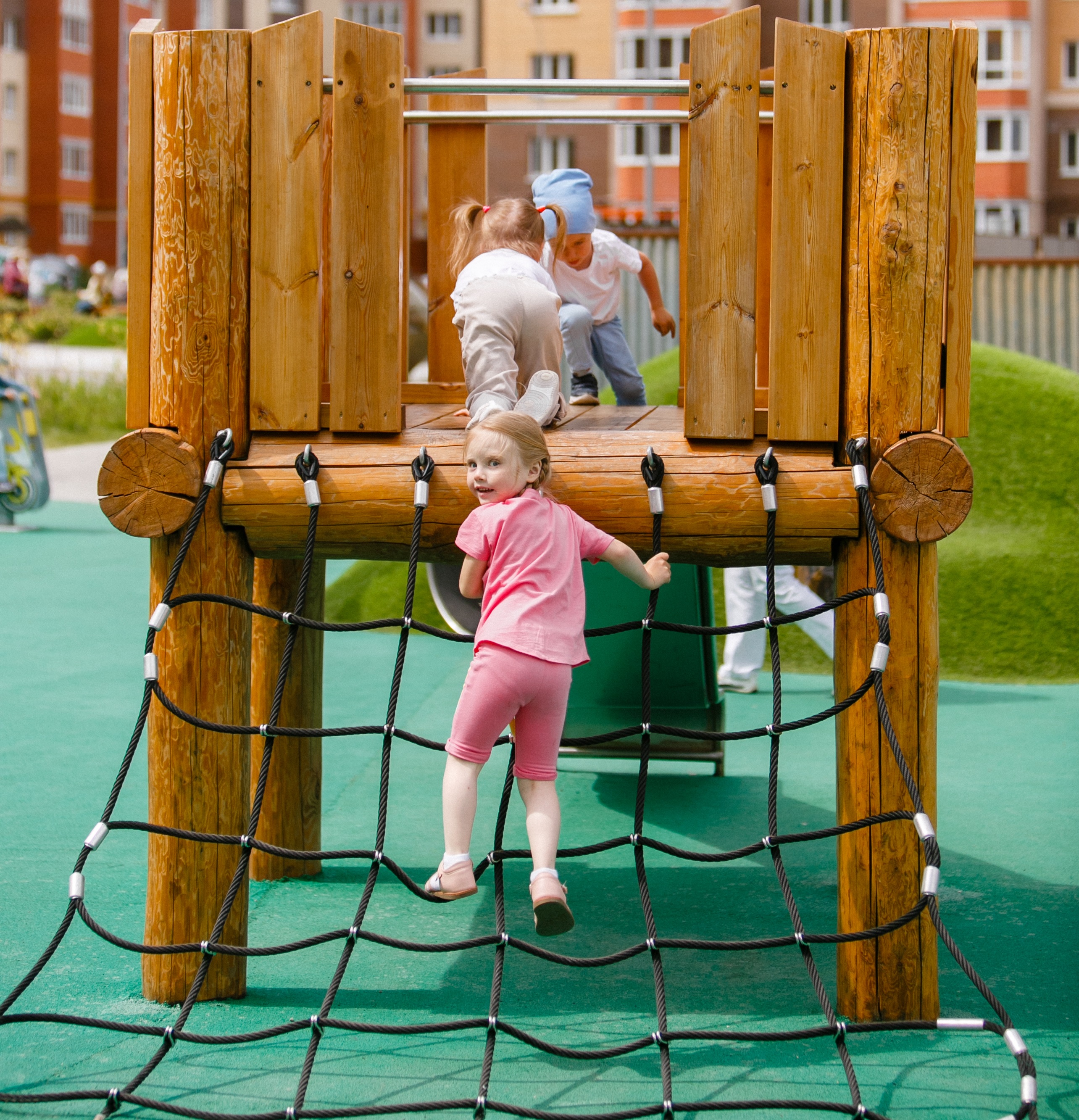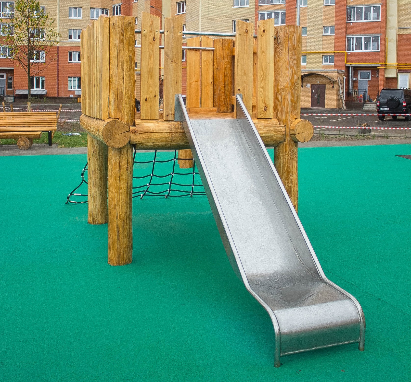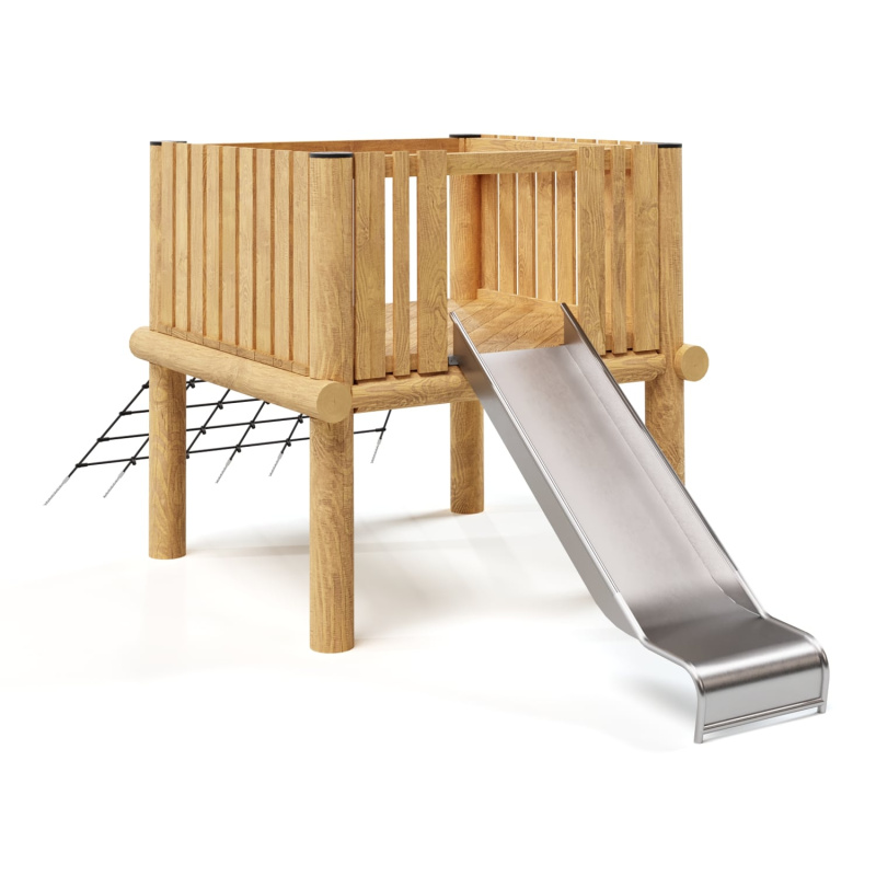 Каркас, обшивка - дерево, покрытие - антисептик, масло террасное атмосферостойкое или акриловая эмаль атмосферостойкая для древесины. Канатные сети, лазы, ограждения - канат армированный 16 мм. Горки, скаты - сталь нержавеющая толщиной не менее 2 мм, электрохимическая пассивация сварных швов.