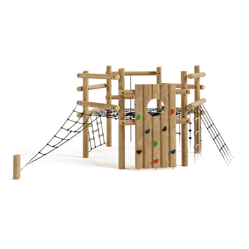 Каркас, обшивка - дерево, обработанное антисептиком и маслом террасным атмосферостойким для древесины в 2 слоя. Металлопрокат - сталь нержавеющая AISI 304, 430. Канатные сети - канат армированный 16 мм. Конвейерная лента. Зацепы - пескобетонный композит.