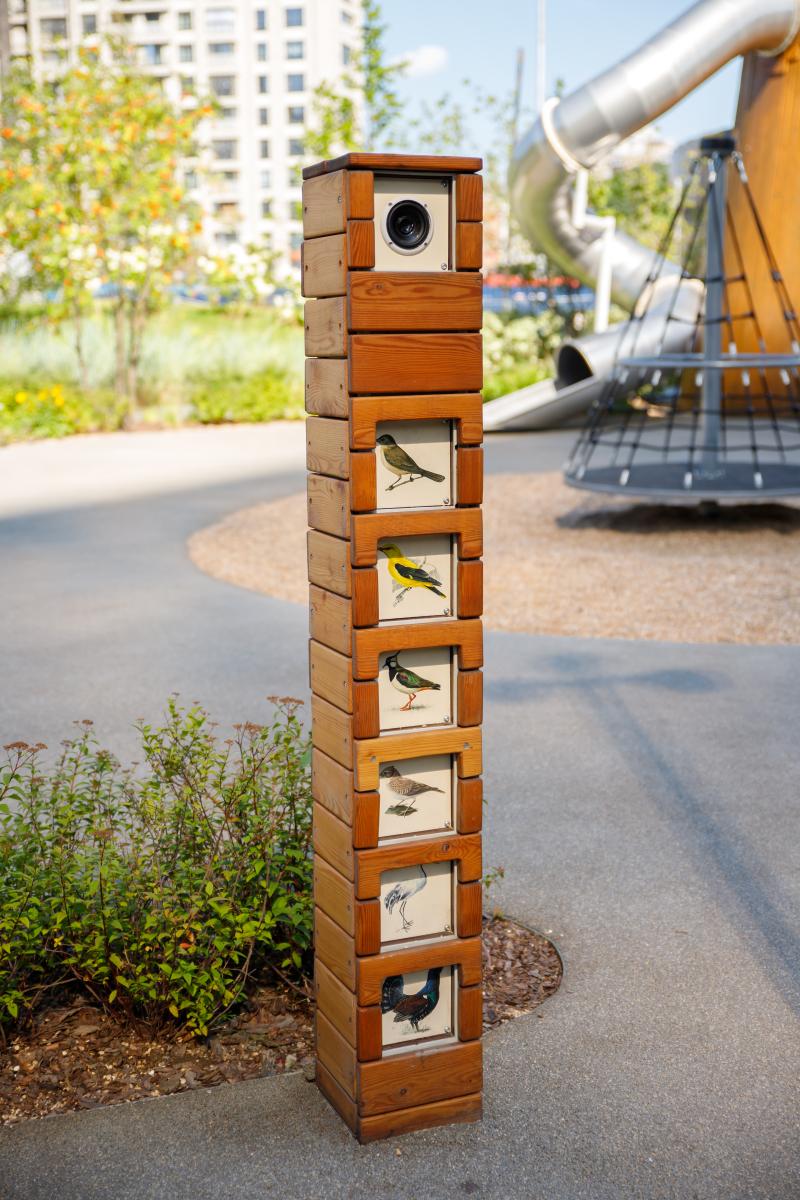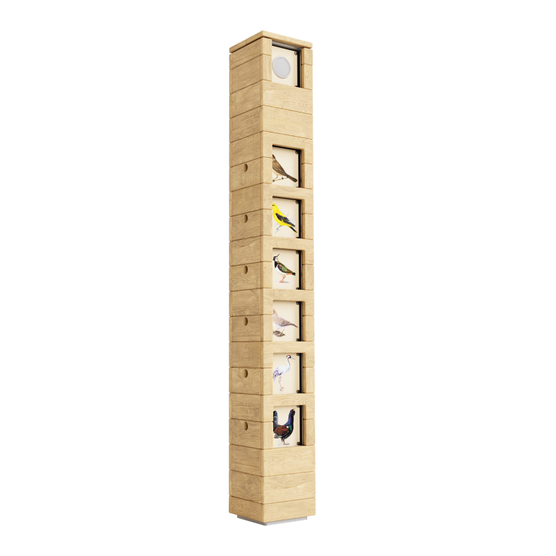 Изделие представляет собой конструкцию из металлического каркаса и деревянной обшивки. На изделии предусмотрены подсвечиваемые окошки с изображением птиц и звуковое сопровождение. Каркас - сталь конструкционная, покрытие - цинкосодержащий грунт, порошковое окрашивание. Древесина обработана антисептиком и атмосферостойким маслом для древесины.