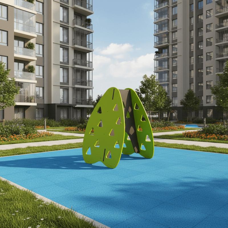 Игровой модуль для тематических игр и физического развития предназначен для детей в возрасте от 4 до 8 лет. Изделие должно представлять собой устойчивую конструкцию, обеспечивающую безопасные условия для занятий на открытом воздухе. Конструкция должна обладать высокой ударопрочностью и виброустойчивостью.В сборе представляет собой конструкцию в виде каркаса из панелей с отверстиями, скрепленную уголками и грунтозацепами, по замыслу напоминает крону дерева.Изделие устанавливается на открытых уличных участках, находящихся под контролем ответственного лица – эксплуатанта. Установка Изделия должна проводится на ровной площадке, свободной от насаждений. В зоне приземления должно быть ударопоглощающее покрытие (песок, древесные опилки) минимальной толщиной 300 мм.
