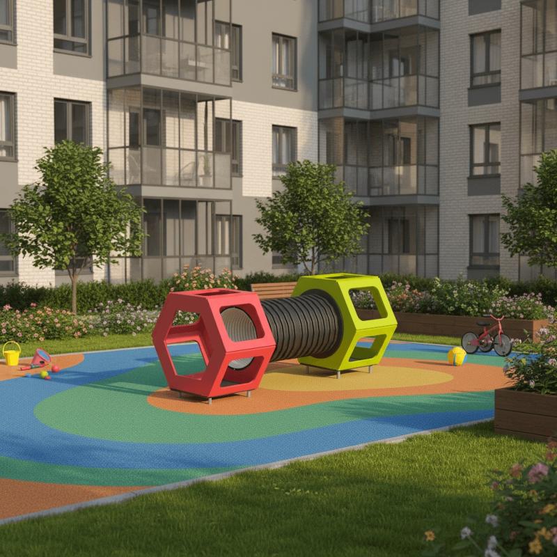 Игровой модуль для тематических игр и физического развития предназначен для детей в возрасте от 4 до 8 лет. Изделие должно представлять собой устойчивую конструкцию, обеспечивающую безопасные условия для занятий на открытом воздухе. Конструкция должна обладать высокой ударопрочностью и виброустойчивостью.В сборе представляет собой конструкцию в виде двух шестигранных игровых элементов, соединенных между собой лазом-трубой гофрированной. Установлен на грунтозацепы.