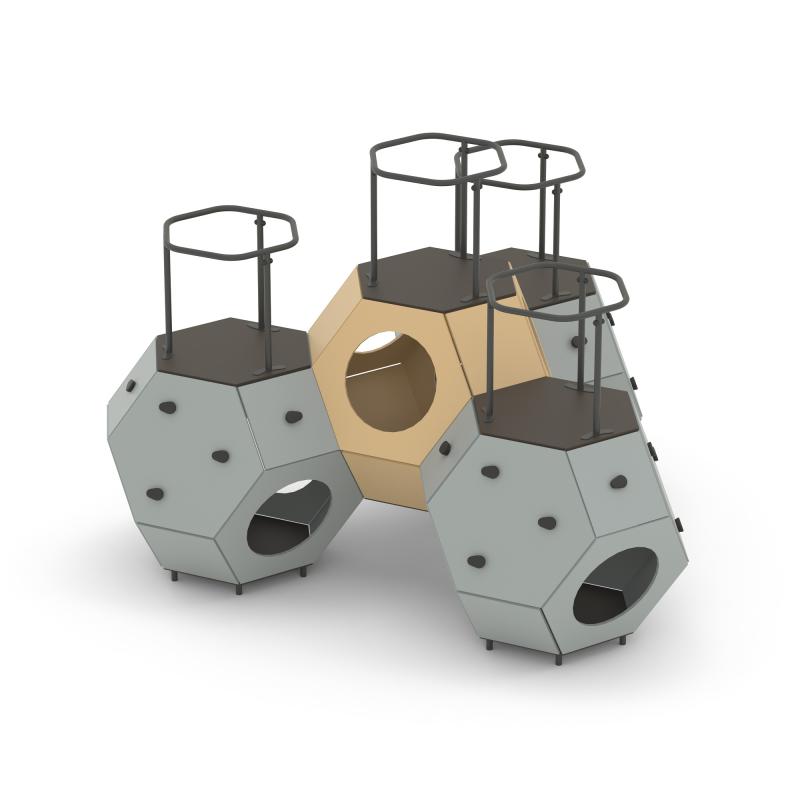 Игровой модуль для тематических игр и физического развития предназначен для детей в возрасте от 8 до 12 лет. Изделие должно представлять собой устойчивую конструкцию, обеспечивающую безопасные условия для занятий на открытом воздухе. Конструкция должна обладать высокой ударопрочностью и виброустойчивостью.В сборе представляет собой конструкцию в виде четырех игровых элементов в виде «усеченного октаэдра», один из которых располагается выше, а остальные три присоединены к шестигранной панели и расположены в плане под углом 120 градусов. Три нижних элемента установлены на грунтозацепы.