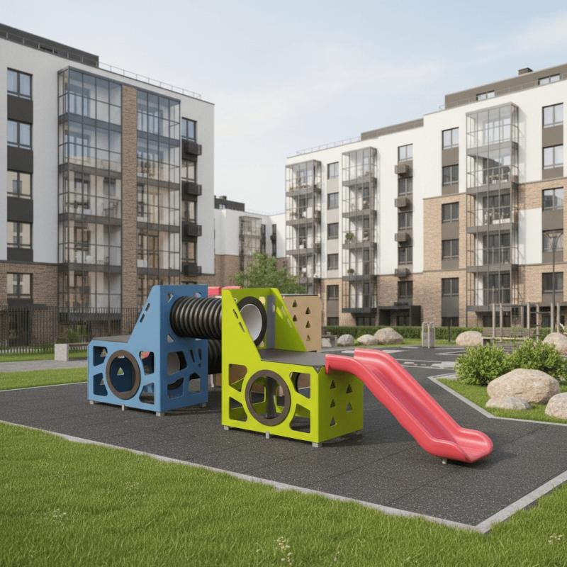 Игровой модуль для тематических игр и физического развития предназначен для детей в возрасте от 4 до 12 лет. Изделие должно представлять собой устойчивую конструкцию, обеспечивающую безопасные условия для занятий на открытом воздухе. Конструкция должна обладать высокой ударопрочностью и виброустойчивостью.В сборе представляет собой конструкцию в виде двух прямоугольных площадок с треугольным лазом, собраных со стенками с помощью уголков, установлены на грунтозацепы. Две площадки присоединены друг к другу с помощью лаза-труба. С одного из торцов прямоугольной площадки с треугольным лазом присоединена площадка прямоугольная с помощью лаза труба. С одной стороны одной из площадок с треугольным лазом установлена горка 950 мм, также еще одна горка установлена на площадке прямоугольного комплекса.Изделие устанавливается на открытых уличных участках, находящихся под контролем ответственного лица – эксплуатанта. Установка Изделия должна проводится на ровной площадке, свободной от насаждений. В зоне приземления должно быть ударопоглощающее покрытие (песок, древесные опилки) минимальной толщиной 300 мм.