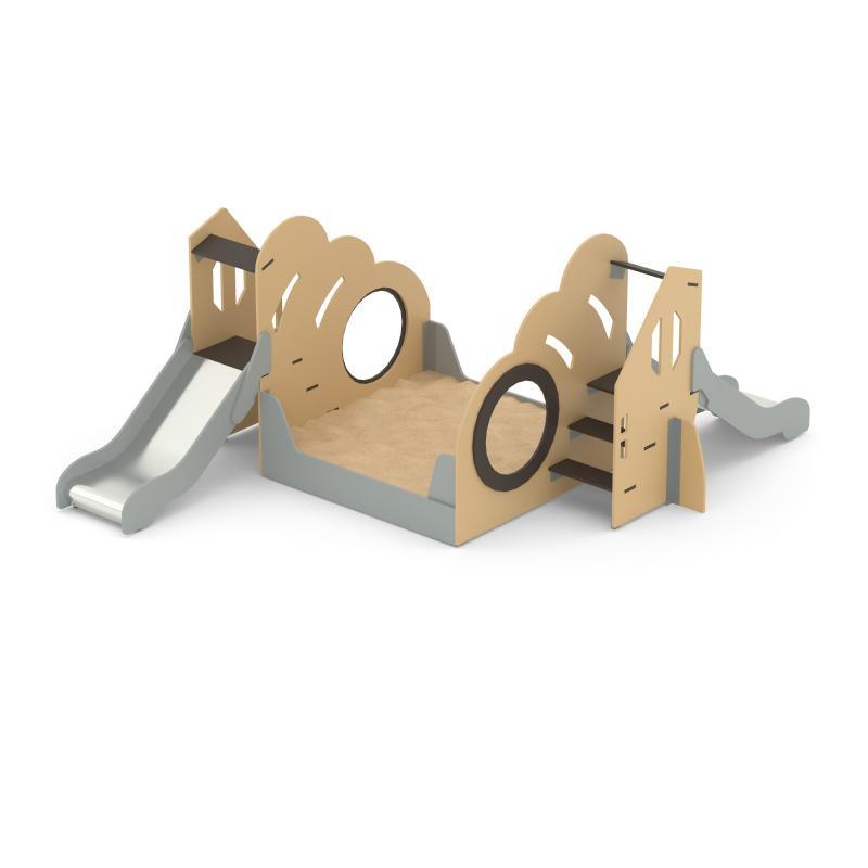 Игровой модуль для тематических игр и физического развития предназначен для детей в возрасте от 3 до 8 лет. Изделие должно представлять собой устойчивую конструкцию, обеспечивающую безопасные условия для занятий на открытом воздухе. Конструкция должна обладать высокой ударопрочностью и виброустойчивостью.В сборе представляет собой конструкцию в виде песочницы, к которой присоединены две горки.Изделие устанавливается на открытых уличных участках, находящихся под контролем ответственного лица – эксплуатанта. Установка Изделия должна проводится на ровной площадке, свободной от насаждений. В зоне приземления должно быть ударопоглощающее покрытие (песок, древесные опилки) минимальной толщиной 300 мм.